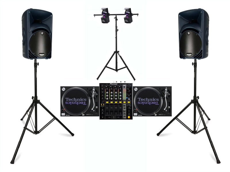 Includes 2 x speakers, 2 x Technics 1210’s and 1 x Pioneer DJM700 mixer and 1 x multi light rig