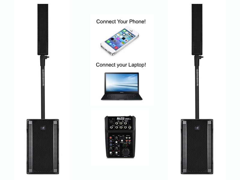 Includes 2 x top speakers, 2 x subwoofers and 1 x mixer for connection to phone, laptop, tablet etc